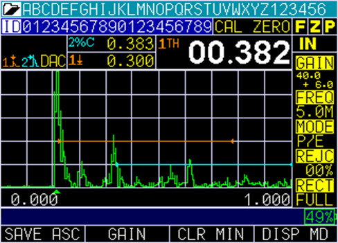 The live waveform (A-scan) is used to verify reading stability. With the live waveform the operator can adjust gain, range, rectification and 2 forms of blanking to set the gage to ignore unwanted noise or mode converted echoes.