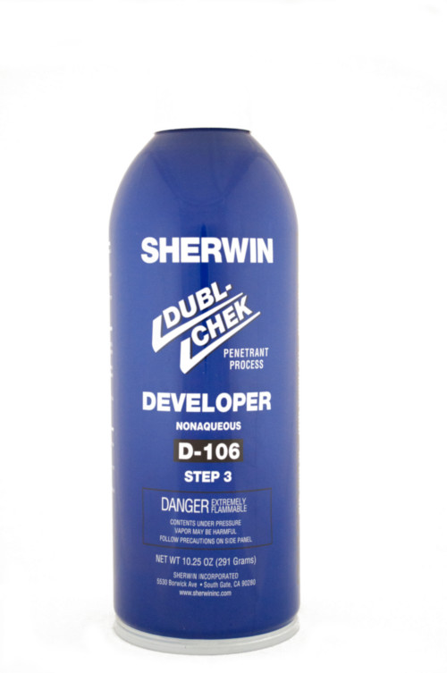 D-106 developer consists of refined white particles suspended in a solution of acetone and isopropyl alcohol. This suspension produces enhanced sensitivity for locating tight flaws, incipient flaws; by solvent and capillary action, it pulls flaw-entrapped penetrant to part surfaces for display against a white background.